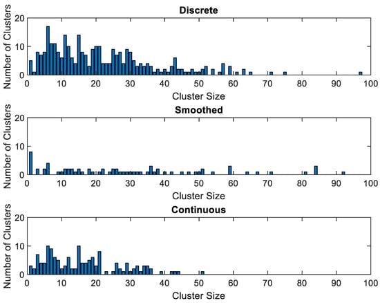 Histogram that shows the number of clusters for each cluster size obtained with the different generation algorithms. There are also 14 clusters with more than 100 consumers in the smoothed case (the biggest one has 965 consumers) and 12 clusters with more than 100 consumers in the continuous case (the biggest one has 813 consumers), which are not shown for the sake of clarity.