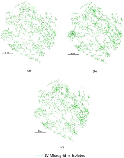 Electrification solutions where candidate mini-grids are calculated with (a) discrete diesel capacities, (b) the smoothed curve, and (c) continuous diesel capacities.