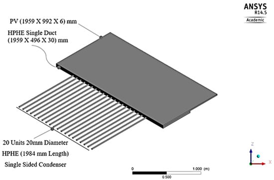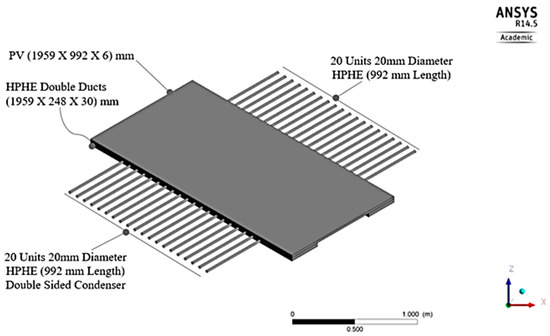 Computational fluid dynamics (CFD) was used as the primary research method in this study by modelling the entire heat pipe integrated PV panel, made up of 20 units of HPHE installed below the 1956 × 992 mm PV surface. Three models of heat pipe arrangement within the HPHE were simulated and spaced at 60, 50, and 40 mm apart at a spanwise distance measured equally between the center of the heat pipes. A flow rate of 0.25 m/s was considered in the determination of the optimum configuration of the heat pipe. ANSYS Fluent (v14.5, ANSYS, Canonsburg, PA, USA) was used to perform the numerical simulations. Furthermore, the HPHE models were tested using both the single-sided and the double-sided condenser direction and were evaluated by shifting the locations from the top, middle, and bottom sections of the rectangular duct.