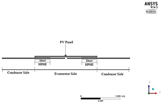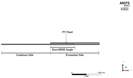 For the heat pipe physical domain, two spacing methodologies were considered: streamwise and spanwise. The design installation in the streamwise direction was not efficient because of the long evaporator pipe length, which led to space restriction on the site. The spanwise heat pipe installation was selected to be studied. The HPHE were installed inside a duct with the same length of the PV panel. There were two HPHE design installations, which were classified into the single side condenser direction shown in Figure 2 and Figure 3, and double side condenser direction of the PV panel shown in Figure 4 and Figure 5.