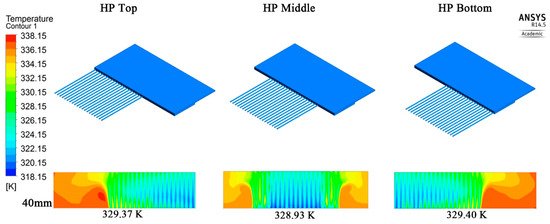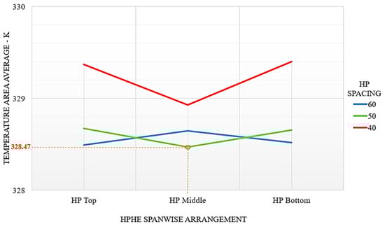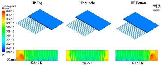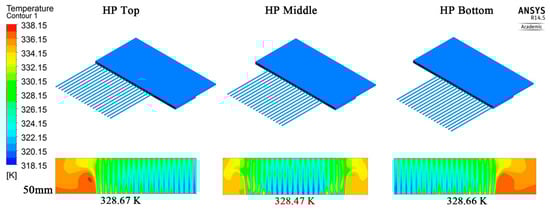 This section presents the findings from this work to determine the optimum heat pipe spanwise spacing using the numerical models shown in Section 3. Figure 7 displays the area weighted average temperatures on each of the simulated models. The minimum temperature in the HPHE evaporator section of 55.32 °C (328.47 K) was recorded on the HP middle model, which had a spacing of 50 mm (2.5 times the diameter of the HP or 2.5D). The highest temperature formation was observed for a heat pipe spacing of 40 mm or 2D in the HP top configuration. This result confirmed that having heat pipes spaced 2.5D apart from each other offers the highest passive cooling potential.