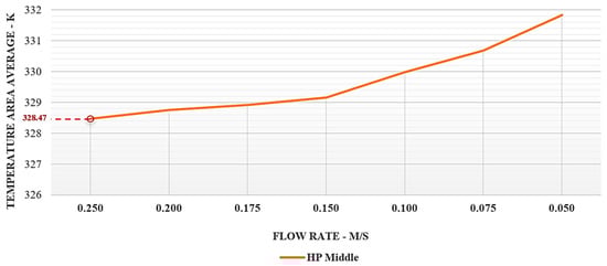 The results of the 60 mm HPHE spacing gained the most uniform result. However, the problem was the middle section, which was the concentration of irradiation absorption for a long period of PV operation and experienced the highest temperature. The findings of the effect of air flow rate on the photovoltaic temperature is shown in Figure 11. Using variable values for the flow rate, which was ranged from 0.05 m/s to 0.25 m/s, the findings indicated an inverse relationship between the two parameters, as the heat pipe temperature decreased, the flow rate of the fluid increased. This was understandable because having a high airflow rate indicates a low contact time between the air and the heat pipe working fluid, thus providing lower cooling potential.