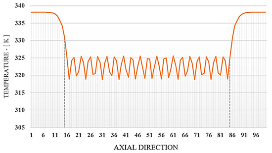The temperature of the heat pipe internal section inserted inside the duct of the HPHE was taken between the axial direction of 15 and 85, as shown in Figure 12. A maximum of 52.43 °C (325.58 K) and a minimum of 45.61 °C (318.76 K) were recorded as the range in temperature variations of the heat pipes that contained water and were inserted in the duct. The temperature was lower in relation to the duct section of the HPHE, which was 54 °C (327.15 K) and did not contain water. These results proved that the water inside the heat pipes acted as a conductor that transferred the warm temperature difference of 1.57 °C from the evaporator to the condenser section of the HPHE than the junction box, which caused the lowering of temperature below the PV panel, as shown in Figure 13.