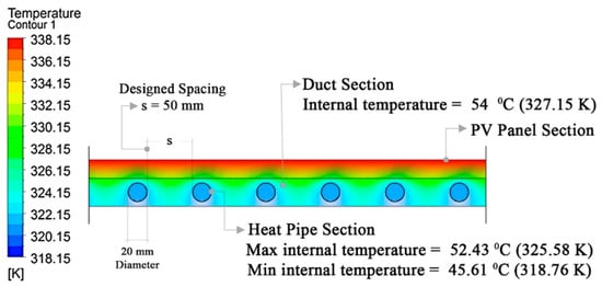 Temperature contour levels on the HPHE are shown in Figure 12, which were taken from the middle installation of the evaporator duct attached to the PV panel, as shown in Figure 4 and Figure 5. The results of the optimum configuration yielded a minimum temperature of 54 °C (327.15 K) within the duct section.