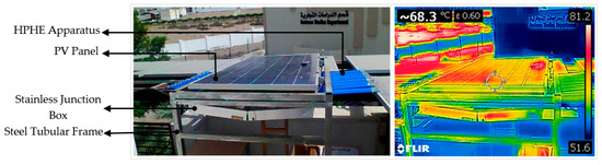 PV-HPHE apparatus isometric model (left) and captured infrared image (right) taken from the top surface assembled in the eco-house, Higher Colleges of Technology (HCT), Muscat, Oman.