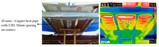 The commissioning of the apparatus shown in Figure 14 and Figure 15 was carried out to experimentally validate the CFD results in order to prove the consistency of the modelling. The top surface temperature of PV-HPHE apparatus, last recorded 1st August 2019 at 12:52 h, was 69.84 °C and the bottom surface temperature was 64.98 °C. The difference in temperature between the top and bottom surface was 4.86 °C with the ambient temperature of 45.70 °C, which was in good agreement with the model. Overall, the simulation focused on heat transfer from the PV panel to the evaporator section of the heat pipe, through to the condenser section to exhaust the heat to the surroundings. The thorough observation of the passive cooling process of the HPHE design helped to decrease the PV panel temperature from 2 to 5 °C on average, which was confirmed from the actual installation.