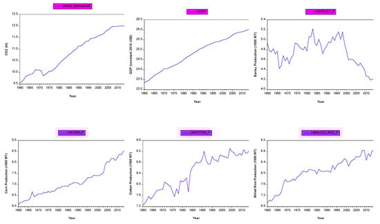 In Equation (2), is the logarithmic form of carbon dioxide emissions, LnGDPt is the gross domestic product (GDP), is the barley production, is the corn production, is the cotton production, is the milled rice production, is the millet production, is the sorghum production and is the wheat production in year t, is the error term, and are the elasticities to be estimated in Equation (2).