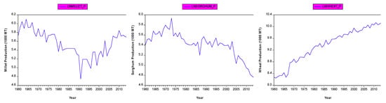 Climate change has resulted in crop reduction in many regions; for example, it was estimated that global maize production reduced by 12 Mt from 1981 to 2002 []. Recently, this methodology has been used in various regions, such as Europe [], Pakistan [], India [] and Ghana [], for the identification of the relationship between climate change and various factors on agriculture. Even the effect of a single weather variable can harm the long-term benefits of economic development []. In South Asia, the production of cereal crops has been already under heat stress. Consequently, in Central and South Asia, the crop yields will decline by up to 30% by 2050 []. The production of these crops is an important factor in food security around the Asian region.