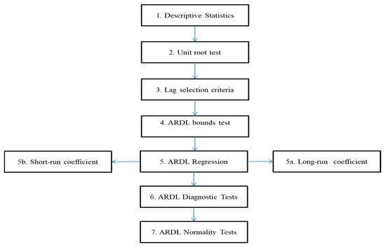 Descriptive statistics are estimated to determine the features of the study variables. To find out the integration order of the study variables, in the first step, we have to identify stationarity in the time series data. For this purpose, we employed the Augmented Dickey–Fuller (ADF) [], Kwiatkowski–Phillips–Schmidt–Shin (KPSS) and Phillips–Perron (PP) unit root tests [], and the ARDL bounds test was then estimated. Furthermore, the pairwise Granger causality test and variance decomposition analysis were carried out to examine the direction of causality and improve the study variables in the future. Figure 2 presents the schematic diagram of the study.