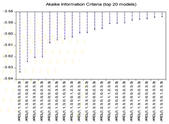 Furthermore, the study uses the Akaike information criterion (AIC) to select the optimal model by employing long-run and short-run associations among variables. Employing the Akaike information criterion shows the top twenty possible ARDL models in Figure 3. Based on the model specification in Equation (2), the short-run and long-run equilibrium relationships of LnCO2, LnGDP, Lnbarley, Lncorn, Lncotton, Lnmilledrice, Lnmillet, Lnsorghum and Lnwheat are estimated using the ARDL regression analysis shown in Equation (3).