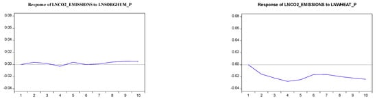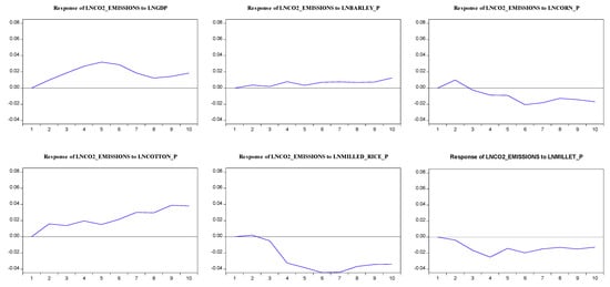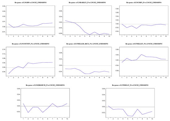 Finally, we employed impulse response analysis in which we employ the response of LnCO2, LnGDP, LnBARLEY, LnCORN, LnCOTTON, LnMILLED RICE, LnMILLET, LnSORGHUM, and LnWHEAT to explain random innovations among them. The random response is not described by the pairwise Granger causality test. The impulse-response of carbon dioxide emissions to Cholesky One S.D. innovations in other variables are displayed in Figure 5.
