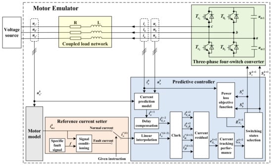 The topology of the motor emulator with reduced switch count is presented in Figure 1. It consists of the three-phase four-switch converter, coupled load network, motor model, the reference current setter and predictive controller. In three-phase four-switch converter, b and c phase are constructed of four active switches and four antiparallel diodes, and a phase is composed of two dc-link capacitors. The coupled load network consists of three-phase resistance-inductance load, where each phase includes a coupled resistance R and a coupled inductance L. The left and right ports of coupled load networks are connected to three-phase midpoint of three-phase four-switch converter and voltage source. The motor model is a squirrel cage asynchronous motor model, which provides a normal three-phase stator current signal. According to given instruction, reference current is generated by reference current setter. When normal instruction is given, a three-phase stator current is adopted directly as reference current signal. When fault instruction is given, fault reference current signal is generated by conditioning three-phase stator current signal and specific fault signal, which is detailed in []. By calculating the current residual between reference current signal and predictive value of load current, the best applicable switch control signal is selected by predictive controller as switch control signal of three-phase four-switch converter for the next second instant.