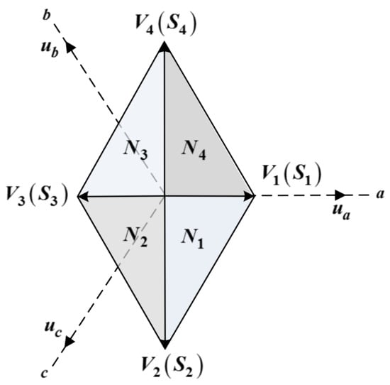 In static coordinate frame, every work period of the three-phase four-switch converter is divided into four sectors by four basic space voltage vectors. The sector formed by two adjacent basic space voltage vectors and is named as , where can be , , and , as shown in Figure 2.