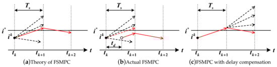 The theory of ideal FSMPC is shown in Figure 3a. Reference stator current is obtained and actual load current are sampled at the k-th instant, and the optimal switch control signal is determined during the k-th sampling period and applied to the system at the k-th instant, then load current will reach the expected value at the (k + 1)-th instant. However, digital process system needs time to perform algorithm, as shown in Figure 3b. The sampling is accomplished at the k-th instant, but the optimal switch control signal is applied to system after delay, which results in error between actual load current and expected value at the (k + 1)-th instant. Thus, the accuracy and rapidity of current tracking is partly decreased, especially for motor operating on fault state and condition suddenly alteration. Therefore, the delay compensation is adopted to regulate action time of the optimal switch control signal, as shown in Figure 3c. Sampling is completed at the k-th instant and calculating the optimal switch control signal during the the k-th sampling period, and applied to the system at the (k + 1)-th instant, then load current will reach the expected value at the (k + 2)-th instant. The delay compensation not only makes up for computation time of the algorithm, but also effectively raises the performance of current tracking for motor operating on fault state and condition suddenly alteration.