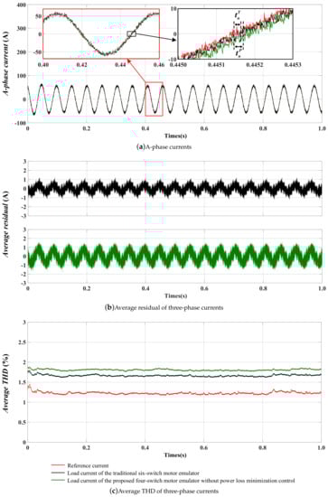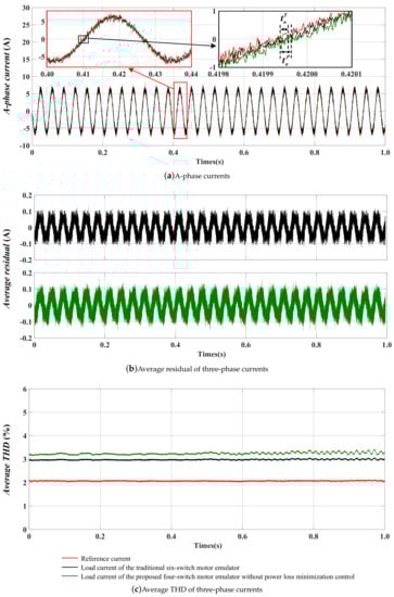 For the high power motor, the experimental waveforms of a-phase reference current, a-phase load current of six-switch motor emulator, and a-phase load current of four-switch motor emulator are shown in Figure 6a. Based on these conditions, the experimental waveforms of average three-phase current residual of between reference current and load current of six-switch and four-switch motor emulator are shown in Figure 6b, respectively. The experimental waveforms of average three-phase current THD (total harmonic distortion) of reference current, load current of six-switch and four-switch motor emulator are shown in Figure 6c, respectively. The switch power loss during entire simulation period of six-switch and four-switch motor emulator are shown in Table 3. Similarly, the experimental waveforms for the low power motor are shown in Figure 7a–c and Table 4.