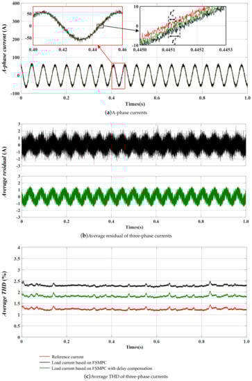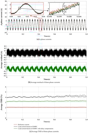 As shown in Figure 8a, comparing to the zero-crossing time of reference current, the zero-crossing time of load current based on FSMPC is delayed by about 45 us, which is expressed as , and the zero-crossing time of load current based on FSMPC with delay compensation is delayed by about 35 us, which is denoted as . From Figure 8b, average three-phase current residual based on FSMPC is about 1.9 A, current tracking accuracy is 96.8%. Average three-phase current residual based on FSMPC with delay compensation is about 1.3 A, current tracking accuracy is 97.8%. In Figure 8c, the average THD of three-phase reference current is 1.30%, and average THD of three-phase load current based on FSMPC and FSMPC with delay compensation are about 2.4% and 1.80%, respectively. From the Table 5, the sum and average switch power loss based on FSMPC and FSMPC with delay compensation are almost equal.
