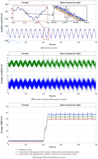 As shown in Figure 11a, when the motor is operating under rotor broken bar fault, comparing to the zero-crossing time of reference current, the zero-crossing time of load current without power loss minimization control is delayed by about 40 us, which is expressed as , and the zero-crossing time of load current with power loss minimization control is delayed by about 50 us, which is denoted as . From Figure 11b, average three-phase current residual of without and with power loss minimization control are about 0.15 A and 0.18 A, and current tracking accuracy are 97.8% and 97.4%. In Figure 11c, the average THD of three-phase reference current is 25%, and average THD of three-phase load current of without and with power loss minimization control is 30% and 35%, respectively. From Table 9, consideration of power loss, the sum and average switch power loss of the latter have both decreased by 21.47% than the former, respectively. The experimental results have shown that, for the high and low power motor, the proposed power loss decrease method can reduce effectively switch power loss on the premise of ensuring the current tracking effect of the motor emulator when the motor is operating under rotor broken bar fault.