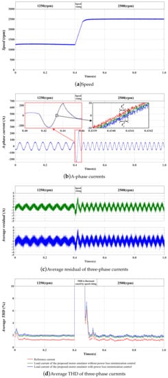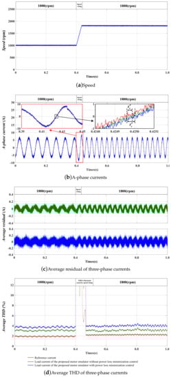 For the high power motor, the experimental waveforms of a-phase reference current, a-phase load current of proposed motor emulator without and with power loss minimization control are shown in Figure 12b. Based on these conditions, the experimental waveforms of average three-phase current residual of between reference current and load current of without and with power loss minimization control are shown in Figure 12c, respectively. The experimental waveforms of average three-phase current THD of reference current, load current of proposed motor emulator without and with power loss minimization control are shown in Figure 12d, respectively. The switch power loss results during the entire simulation period of the proposed motor emulator without and with power loss minimization control are shown in Table 10. Similarly, the experimental waveforms for the low power motor are shown in Figure 13b–d and Table 11.