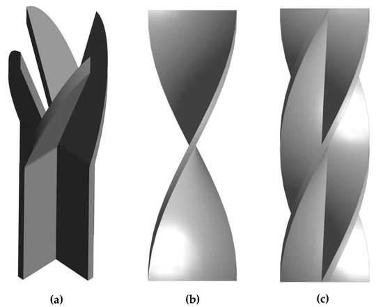 Design of the static swirl elements (3D view): (a) blade [11]; (b) single helix [5,10,12,13]; and (c) double helix [13].
