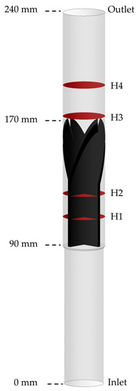 Four measurement planes (see Figure 2 and Table 1), in which the radial gas fraction profiles can be estimated by the bi-modal bubble size approach as demonstrated in our previous work for the blade element [11], were used for the comparisons among various swirl elements. An experimental measurement uncertainty of less than 1% was assumed based on the work in Reference [15]. Figure 2 shows the domain of CFD simulations based on the relevant part of the experimental test section. A detailed explanation of the experimental setup is given in Reference [11], while the explanation of the system and the method for data processing can be found in References [16,17,18].