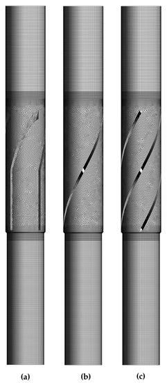 Graphical representation of the computational mesh: (a) blade; (b) single helix; and (c) double helix.