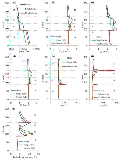 Axial profiles of: (a) pressure, (b) G1 velocity, (c) G2 velocity, (d) liquid velocity, (e) G1 fraction, and (f) G2 fraction and (g) liquid turbulence intensity obtained from simulations using various swirl elements.