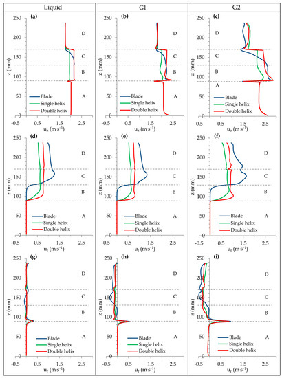 Axial profiles of velocity components obtained from simulations using various swirl elements: (a–c) vertical velocity of liquid, G1 and G2, respectively; (d–f) tangential velocity of liquid, G1 and G2, respectively; and (g–i) radial velocity of liquid, G1 and G2, respectively.