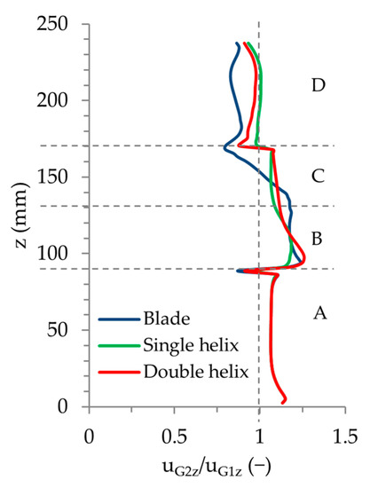 Figure 4b–d represents the axial profiles of the cross-sectional averaged gas G1 velocity, gas G2 velocity, and liquid velocity, respectively. For all swirl elements, no differences in the velocity profiles can be observed in the region upstream of the elements (i.e., region A). The most significant velocity component in this region was the vertical velocity (see Figure 5a–c). Figure 6 shows the axial profile of the ratio of G2 vertical velocity to G1 vertical velocity. It can be observed from the figure that, in region A, the vertical velocity of G2 is larger than that of G1 which is indicated with the ratio bigger than one. This can be explained by considering the equilibrium between the buoyancy and drag force. The buoyancy force is proportional to the bubble volume. This has to be compensated by the drag force which requires a larger relative velocity. Therefore, the vertical velocity of G2 was larger than that of G1. In other regions, where significant swirling flow was generated, other forces beside buoyancy and drag force (e.g., virtual mass) play a significant role. Therefore, at this condition, the vertical velocity of G2 can also be smaller than that of G1. The axial profile of the tangential velocity component shows that the magnitude of this velocity component was negligible (see Figure 5d–f) in region A. This indicates that the swirling flow had not yet been generated in this region as visualized by the smooth and straight streamlines of the liquid velocity for all swirl elements (see Figure 7). It is interesting to note that the axial profile of the radial velocity component of the larger bubble size (i.e., G2) showed negative values in region A. This was caused by a negative sign of lift coefficient of G2 which led this gas structure to migrate in the radially inward direction (i.e., toward the center of the pipe) as reflected by the converging streamlines of G2 velocity (Figure 8).