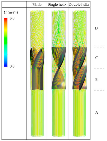 The velocity profile among the various types of swirl elements started to differ around the entrance to the elements (see Figure 4b–d). The velocity fluctuated around this region which led to the fluctuation of the gas fraction (see Figure 4e,f). This fluctuation can also be described by the increase of liquid turbulence intensity (see Figure 4g). For all swirl elements, the increase of liquid velocity, G1 velocity, and G2 velocity in region B was observed. In the case of the blade element, the increase in these velocities was mostly associated with the reduction of the cross-sectional area of the pipe (i.e., the area decreased around 6%) due to the presence of the blade element. The swirling flow had not yet been generated as indicated by a negligible value of the tangential velocity component for the blade element (see Figure 5d–f) except in the near end of this region. In the case of the single helix, the increase of the liquid, G1, and G2 velocity was caused mostly by the generated swirling flow, as no reduction of the cross-sectional area occurred in the domain. The tangential velocity increases significantly as the flow enters this region. In the case of the double helix, both the reduction of the cross-sectional area and the generated swirling flow contributed to the increase of the velocities. The streamlines of liquid velocity (Figure 7) and gas velocity (Figure 8) show the different flow characteristics in region B among the various swirl elements. In contrast to the streamlines of the blade which still show a relatively smooth and straight flow for both liquid and gas, the streamlines of the single and double helix in this region indicate that the flow had been twisted following the curvature of the elements in that region. It can be inferred from Figure 5d–f that the tangential velocity in the case of the double helix was larger than that of the single helix reflecting that a stronger swirling flow was generated in the case of the double helix.