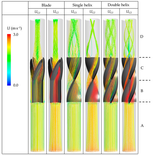 A significant increase of liquid velocity, G1 velocity, and G2 velocity for the blade element occurred in region C (see Figure 4b–d). The major contribution of this velocity increase came from the tangential velocity component that increased drastically (see Figure 5d–f), indicating that a significant swirling flow was generated in this region. This generated a swirling flow even more intensive compared to the one achieved in the single and double helix as reflected by the largest tangential velocity obtained by the blade element. The streamlines of the liquid velocity (Figure 7) show that a swirling flow bounded by the pipe wall formed for the liquid. In contrast to the streamlines of the liquid velocity, the streamlines of gas velocity, both for G1 and G2 (Figure 8), concentrated in the center of the pipe indicating that the gas immediately migrated toward the center of the pipe in this region. In contrast to the increase of tangential velocity for the blade element, the tangential velocity for the single and double helix remained relatively constant in this region. It is interesting to observe that the increase in the tangential velocity for the blade element was followed by a smooth decrease in its vertical velocity (see Figure 5a–c). A gradual increase in the cross-sectional area, as the area occupied by the blade swirl element decreased due to the geometry of the curvy blades, contributed to the decrease in the vertical velocity. In contrast to the blade element, a sudden increase in the cross-sectional area just downstream of the single and double helix led to a steeper decrease of the vertical velocity. The largest drop in the vertical velocity for all swirl elements occurred for G2 which led to the large increase of the cross-sectional averaged G2 fraction (see Figure 4f). The highest peak of the G2 fraction was observed from the plot for the double helix due to the largest decrease of its vertical velocity. It seems that a local region with the lowest G2 velocity formed in the center region of the pipe just downstream the double helix as shown in the G2 velocity streamlines (see Figure 8). The drastic increase of gas volume fraction close to this region can also be related to the increase of liquid turbulence intensity (see Figure 4g).