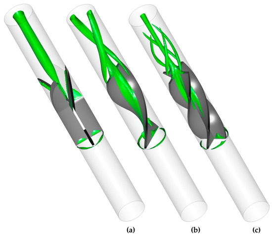 The swirling flow in the region downstream of the swirl elements (i.e., region D) for the blade element remained stronger in comparison to that of the helical elements as can be observed from the plot of tangential velocity (see Figure 5d–f). From the images of the iso-surface of the gas volume fraction (Figure 9), it is inferred that a single gas core in the center of the pipe formed downstream of the blade element, while a multiple gas core was observed for the single and double helix. This phenomenon reflects the influence of the swirl geometry on the characteristic of gas and liquid separation due to the swirling elements. From the perspective of the effectiveness of the inline separator design, a single gas core in the center of the pipe is preferable, since the gas will be easier to be removed by the gas removal mechanism which is located in the center of the pipe. Therefore, the blade swirl element is suitable to be used for inline separator. For the helical swirl elements, the formation of a single gas core in the center was not necessary, since the intended application of those elements is in a static mixer.
