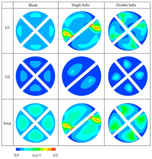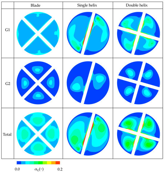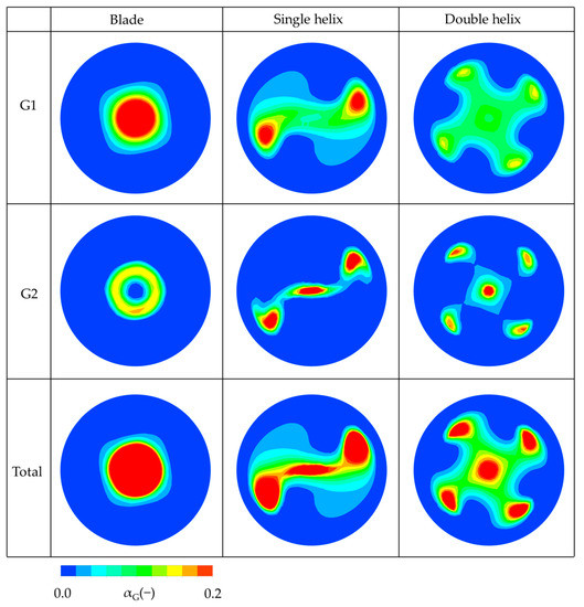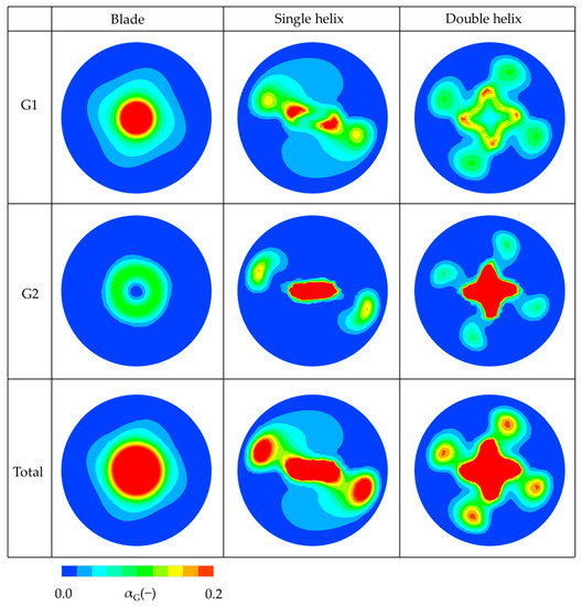 The calculated gas distribution at the measurement plane H2 are presented in Figure 11. For the blade element, a similar trend was observed as in the measurement plane H1, since H2 was located in the same region as H1 (i.e., the straight plates) in which the swirling flow was not yet generated. In contrast to the blade element, gas distribution in the case of the single and double helix was further developing under the influence of the centrifugal force generated by the swirl elements. The gas phase migrated toward the center of the pipe; thus, the location of the maximum gas fraction shifted from the center of each divided area to the center of the pipe. The radial gas profiles in Figure 16 confirmed this fact. The peak at the center of the pipe for the single and double helix was approximately twice the peak value as in the case of the blade element.