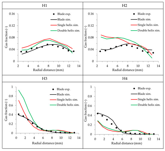 Figure 12 shows the calculated gas fraction at the measurement plane H3. Since this measurement plane was located in region D (i.e., downstream of the elements), the characteristics of the gas–liquid flow in all of the swirl generating devices was highly influenced by the swirling flow. A round concentric gas located at the center of the pipe was observed in the simulation of the blade element. The shape of the gas distribution obtained from the simulations of the single and double helix was rather different to the one observed in the blade element. The gas core in the center of the pipe surrounded by two and four round shape gas structures was observed in the simulations of the single and double helix, respectively. Figure 16 shows that the largest peak of the gas fraction close to the center of the pipe was obtained in the case of the double helix. The value of the gas fraction at this peak was larger than twice that of the peak value obtained in the simulation as well as in the experiment of the blade swirl element. It is also inferred from Figure 14 that the calculated peak value obtained in the simulation of the single helix was also significantly higher than the one obtained in the blade element. It is also interesting to note that the gas fraction of G2 contributed most of the gas fraction in the center of the pipe in the case of the single and double helix. However, the gas distribution drastically changed within only a 20 mm distance in the case of the single and double helix. Figure 13 shows that the gas concentration in the center of the pipe became smaller, while the concentration of the surrounded gas structure became stronger in the measurement plane H4 for the aforementioned swirl elements. The plot of the gas fraction profile (Figure 14) shows that the peak value in the center of the pipe, for the case of the single and double helix, decreased to less than 50% of the one obtained in the plane H3. However, an increase in the area of the peak closer to the wall was observed for those two swirl elements. In contrast to the single and double helix, the gas profile in the experiment with the blade element showed a relatively stable gas distribution with a peak value close to the center of the pipe around 0.4. The results indicate that the blade element is preferable to be used in an inline separator. The helical swirl elements, although they may cause separation of gas and liquid to some degree, are preferable to be used in the mixing process. The results also suggest that the gas removal mechanism in an inline separator should be designed with care. This means that the location for placing the gas outlet should consider the evolution of gas structures specific for the type of swirl element used in the device. For example, if the blade element should be used in an inline separator, it is the best option if the gas outlet is located in the measuring plane H4, since the gas core is already relatively stable at this location. However, the design of this blade swirl element should also be optimized, since the peak value was still rather low. The gas should be more concentrated in the center of the pipe to increase the performance of the inline separator.