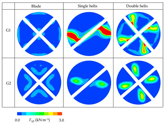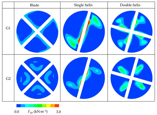 From Figure 10 and Figure 11, it can be inferred that the gas fraction was quite high near the single and double helical elements. The interfacial forces acting on the bubbles influenced the distribution of the gas fraction. One of them was the lift force which is formulated in Equation (6). Therefore, to give a description of the influence of the lift force, the distribution of lift force magnitude in plane H1 and plane H2 is presented in Figure 15 and Figure 16, respectively. It can be observed from Figure 10, Figure 11, Figure 15 and Figure 16 that the gas distribution was significantly influenced by the lift force magnitude. For example, the location of the maximum G2 fraction near the single and double helical element, shown in Figure 10 and Figure 11, was strongly related with the position of the G2 maximum lift force magnitude shown in Figure 15 and Figure 16.