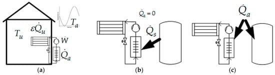 Schemes of the heat pump in the building, and when operated with the heat storage. (a) The condenser heats the building while the evaporator is outside. (b) During the first sub-period, the evaporator receives heat from the storage only. (c) During the second sub-period, the evaporator receives heat from ambient air, and so does the heat storage when it is colder than ambient air.