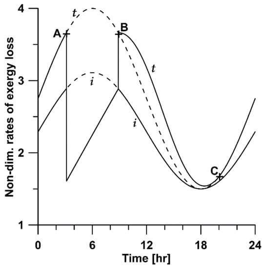 Typically, the former case applies to heat pumps that extract heat from ambient air, while the latter applies to processes which release heat to ambient air: engines, cooling machines, etc. It can also be said that T0 takes the value of the ambient air temperature that is the most favorable to the process under consideration. Seen as an exergy loss, the product [] corresponds to the transfer of the heat flux between T0 and . Although this transfer does not occur in the process (the corresponding heat exchanger is not at T0), that loss of exergy can nevertheless be reduced by exchanging as much heat as possible with ambient air when the distance is minimal, and as little heat as possible when that distance is maximal. This strategy improves the energy efficiency of the process, as described in Section 3.3, and reduces the value of . It requires the presence of a heat storage. When the process includes a heat storage, the circadian cycle can be divided into two sub-periods. In the first one, when the distance is globally large, the process is isolated from ambient air. It nevertheless delivers its duty thanks to the heat storage. In the second sub-period, when the distance is globally small, the whole process exchanges with ambient air more heat than strictly required for delivering the duty because meanwhile, the heat storage must recover its initial state.