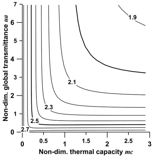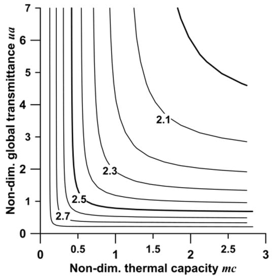 Non-dimensional total exergy loss (iso-curves) as a function of the non-dimensional design parameters, mc and ua.