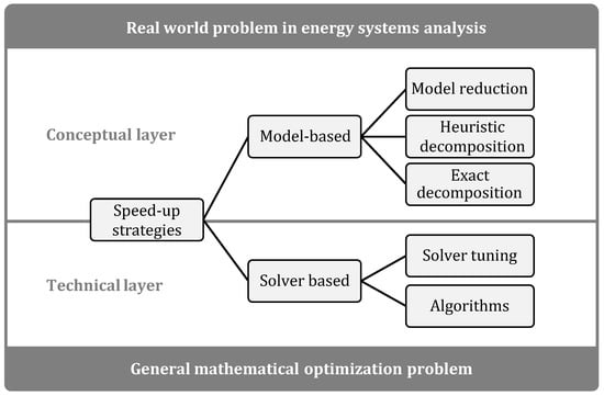 Despite the existence of a large number of speed-up approaches for ESOMs, it is not clear which methods are the most promising ones to improve the performance of ESOMs that are used in the field of applied energy system analysis. In addition to the arrow-head structure of the coefficient matrix (presence of linking constraints and linking variables, see Section 1), a majority of these models share three characteristics []: