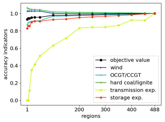 Despite the availability of a broad spectrum of sophisticated aggregation techniques, in the context of energy system analysis, the applied literature is governed by simple spatial aggregation approaches. In particular, they are usually characterized by a summation of demand and generation capacities, whereas intra-regional flows are neglected and regions are grouped based on administrative areas, such as market or country borders [,,]. Reasons therefore are, on the one hand side, the availability of required, large data sets of spatially explicit data for the broad diversity of technologies, such as potentials and existing infrastructure. On the other hand, the majority of network equivalents are based on pre-computed system states of the spatially highly resolved model, for example, a solved power flow study. This in turn requires the application of nested approaches (Section 2.3), where first simplifications to other scales of an ESOM are required in order to obtain the power flows of the entire network. By this means, reasonable simplifications are the use of time-slices in form of operational snapshots and the summation of power supply from all generation technologies.