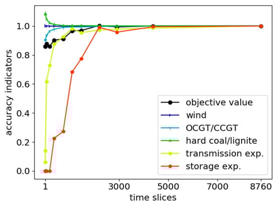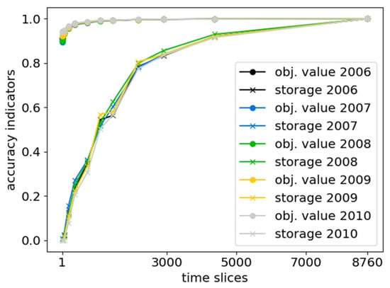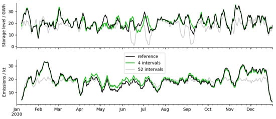 Comparing the different reduced models used in a nested approach, typically, a decrease of resolution on one scale is accompanied by an increase on another. In this regard, one common approach is decoupling investment decisions by “temporal zooming”. First, a power plant portfolio is developed over the analyzed planning horizon using a simplified dispatch model and pre-defined time-slices to simulate the planned operation. In order to check whether the derived power plant portfolio performs well for a selected target year, UC constraints are added and capacities are fixed in the subsequent model run(s) [,,]. Babrowski et al. call a similar method “myopic approach” []. In this case, for each year of the planning horizon a model run is performed, whereas the resulting generation expansion is taken as an offset of installed power generation for the subsequently analyzed target year.