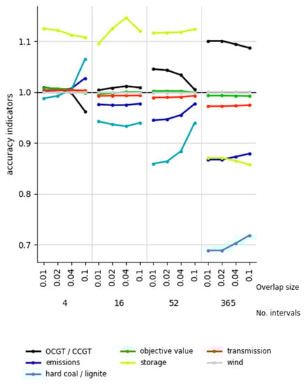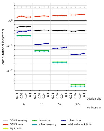 An optimal number of time windows usually exists depending on the model size, since the computational overhead for creating reduced models increases with the number of intervals. Furthermore, the planning horizon of an individual time window usually includes more time steps than necessary for the partial solution. In the context of energy system analysis, this overlap is important to emulate the continuing global planning horizon. Especially the dispatch of seasonal storage units is strongly affected by this as, without any countermeasures, it is more cost-efficient to fully discharge the storage until the end of an operational period. Also time-linking variables and constraints, such as annual limits on emissions, can barely be considered in this way since global information regarding the temporal scale can only be roughly estimated for each time window. For this reason, inter alia indicated by a trend to overestimate the total system costs [], the aggregation of interval solutions does not necessarily end up at the global optimum of the original problem.