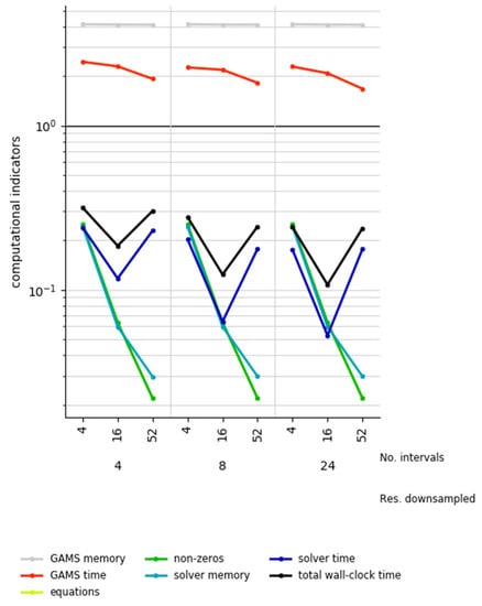 Temporal aggregation refers to representative time periods or the process of down-sampling data derived from a highly resolved initial data set. Down-sampling is a method where time series based input data is coarsen to a lower temporal resolution (e.g., by averaging from 1-hourly to 6-hourly). In ESOMs, down-sampling typically affects demand profiles (e.g., electric or heat load) and the power feed-in from vRES. Although the approach is an effective way to reduce computing times—Pfenninger [], for example, shows a reduction of computing time by up to 80% (scenario 90% 2014)—the method is rarely applied. This is due to the claim to capture the dynamics of variable power provision from renewable energy technologies. By this means, ESOMs typically rely on their highest resolved data and often use hourly input []. Exceptions can be found in studies that analyze the impact of different temporal resolutions in unit commitment approaches, e.g., in Deane et al. [] (5, 15, 30 and 60 min) or in O’Dwyer and Flynn [] as well as in Pandzzic et al. [] who both compare a 15 min resolution with hourly modeling.