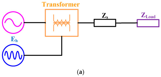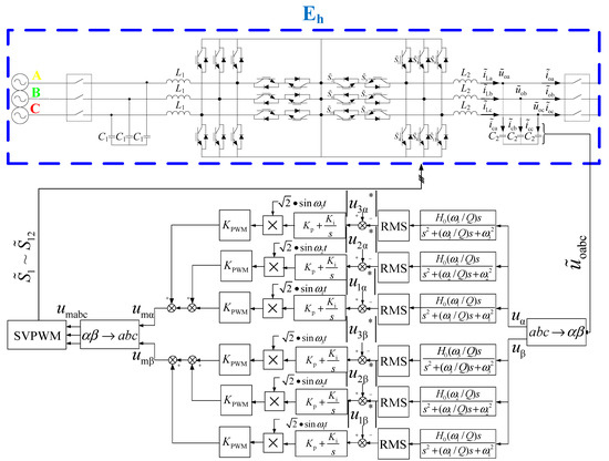 The corresponding grid source simulator system topology is shown in Figure 1b. From the topology, we can see that the voltage source Eg is generated by a high-power, back-to-back, two-level circuit with a fundamental LC filter; the harmonic voltage source Eh is generated by a series of low-power but high switching frequency, back-to-back, three-level circuits with a harmonic LC filter; and the output capacitance voltage of the fundamental LC filter is connected to the output capacitance voltage of the harmonic LC filter through a series injection transformer. The series injection transformer consists of three single-phase injection transformers; each single-phase injection transformer has a double-winding structure, and the three-phase neutral points are connected together. The voltage source Eg series coupling with the harmonic voltage source Eh component is the system source. The virtual line impedance Zs is realized by the control strategy in the following section. The system ZIP load Zload is realized by a back-to-back, two-level circuit shown in the topology. The back-to-back topology can realize the four-quadrant operation of energy, and also the feedback energy to the power grid.