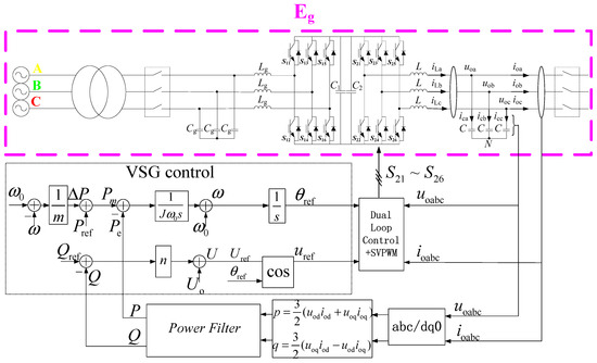 The proposed VSG frequency control is analogous to that of a synchronous generator (SG) in Figure 2. Thus, we assume a virtual inertia constant J for the VSG unit, such that speed ω of the voltage space vector of the VSG terminal is governed by the amplitude closed-loop control method of lower-power, back-to-back converter.