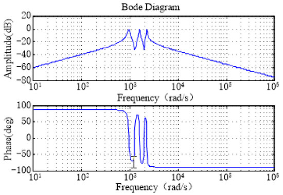 where ωn (n = 1,2,3) is central angular frequency; H0 is the maximum amplitude at the central angular frequency, and the amplitude decreases by 20 dB/dec distance from the central angular frequency; Qf is the quality factor, which represents the sharpness of the frequency response curve of the filter, usually with a value of 5–10. Figure 4 shows the transfer function bode diagram of the amplitude closed-loop control with three harmonic combinations, among which Q = 5, H0 = 1, ω1 = 2π × 150 rad/s, ω2 = 2π × 250 rad/s, ω2 = 2π × 250 rad/s. From Figure 4 we can see the voltage at the three central angular frequencies, which is able to be accurately tracked.