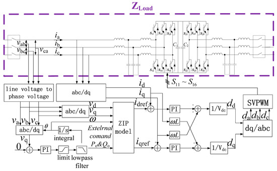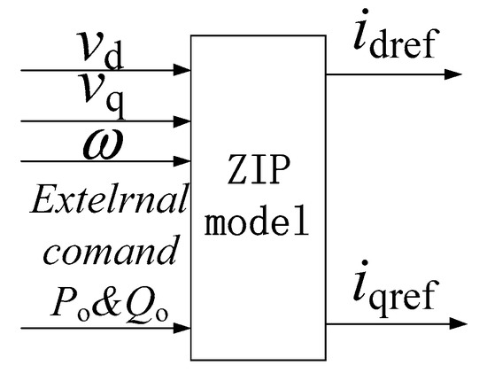 As presented in Figure 8, the emulated model uses voltages in the dq domain and emulated grid frequency as inputs for the ZIP model. External base real and reactive power commands are given to the model for specifying the actual power desired by customers. Output currents are calculated using the Equations (11) and (12) based on power equivalence relationship in the dq domain. The load emulator current behavior is controlled accurately according to the references so as to ensure the power consumptions at the load bus are the ones described in (13) and (14).