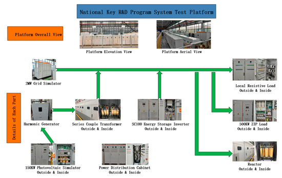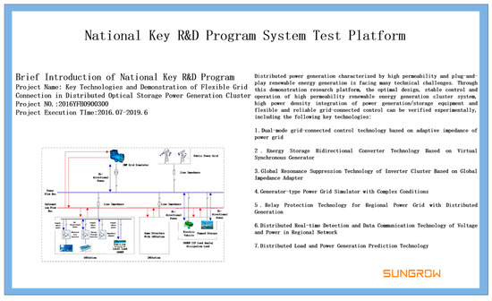 In order to verify the correctness of the theoretical analysis and the feasibility of the design scheme of the MW multifunctional power grid simulator, an experimental platform of a 2MW power grid simulator was built and the corresponding experimental verification was carried out. The platform relies on the National Key R&D Project; Figure 9 is a brief introduction of the whole project. The key technology is the generator-type power grid simulator with complex operating conditions mentioned in this paper. The demonstration project establishes a configuration visualization master control platform shown in Figure 10 based on LabVIEW, and realizes the terminal control of the whole demonstration system through ModBus industrial communication protocol. The experimental platform hardware photos are shown in Figure 11; among them the digital processing chip of the system adopts the TMS320LF283xx produced by Texas Instruments Company located in Dallas, TX, USA.