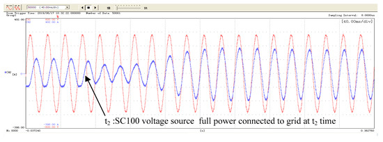 Voltage and current waveform of SC100 full power voltage source connected to grid.