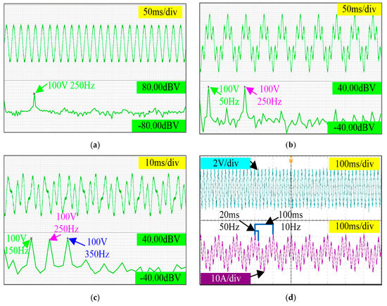 Fundamental and characteristic or noncharacteristic harmonic combination voltage of grid simulator without load: (a) no-load output of the simulator 100 V 250 Hz voltage; (b) simulator no-load output 100 V 50 Hz and 100 V 250 Hz combined voltage; (c) simulator no-load output 100 V 150 Hz, 100 V 250 Hz and 100 V 350 Hz combined voltage; (d) the simulator output 50 Hz fundamental wave and 10 Hz noncharacteristic harmonic voltage.
