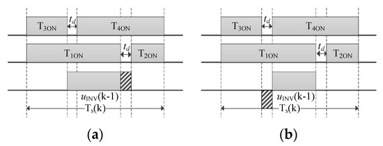 As shown in Figure 16, if the dead time is added to the gate level drive of the upper and lower tubes of the bridge arm, such as the delay opening td, the output voltage of the inverter bridge will be different from the ideal command voltage, which is related to the current flow direction. As shown in Figure 17a,b, when the current flows to the middle point O of the bridge arm, during the period when T3 is normally closed and T4 is delayed to open, D1 and D4 will continue to flow, and the output voltage of the bridge arm is equal to Vdc, that is to say, the output voltage is the same as the ideal command voltage in this dead time. In the second dead time period (i.e., when T1 is normally closed and T2 is delayed to open), D1 and D4 will continue to flow, and the output voltage of the bridge arm is equal to Vdc. During this period, the output voltage should be zero, which is the error caused by the dead time voltage. In the first Td, the output voltage is equal to zero, and the deviation from the ideal Uinv is −Vdc.